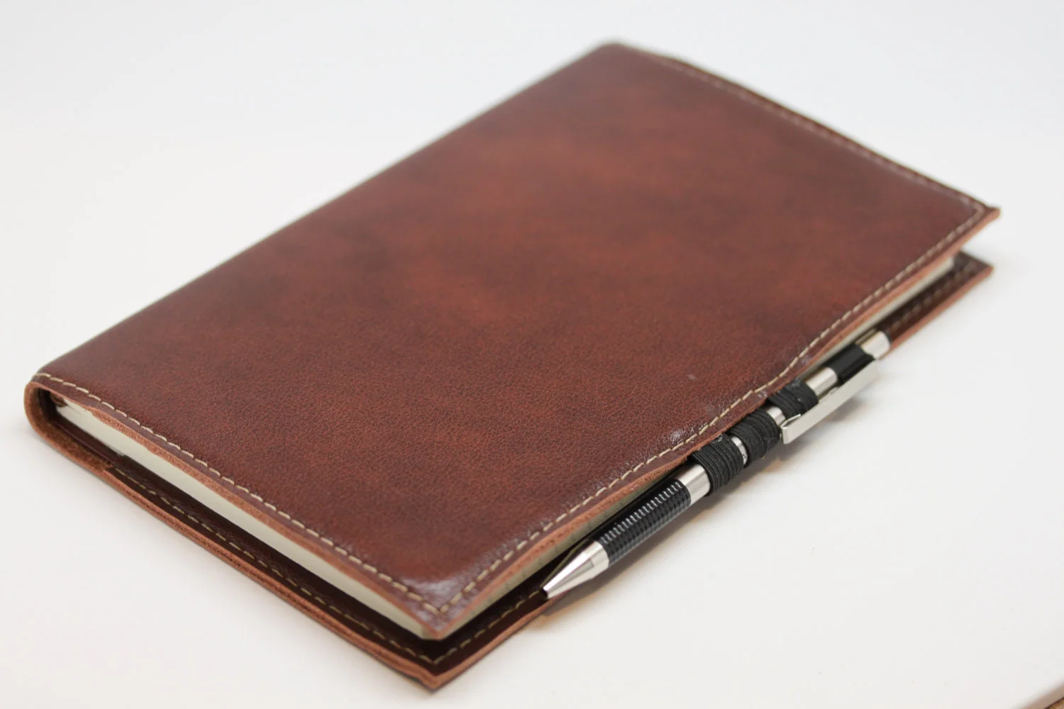 This Journal holder is made from a beautiful smooth and rich brown leather. The leather is soft and of superb quality! The leather is wonderful to touch and smells like leather should!