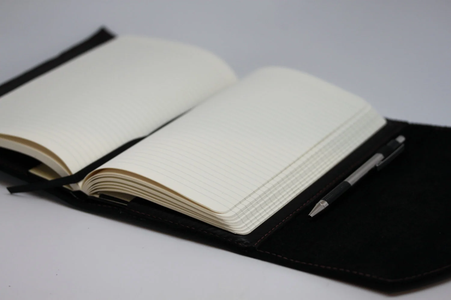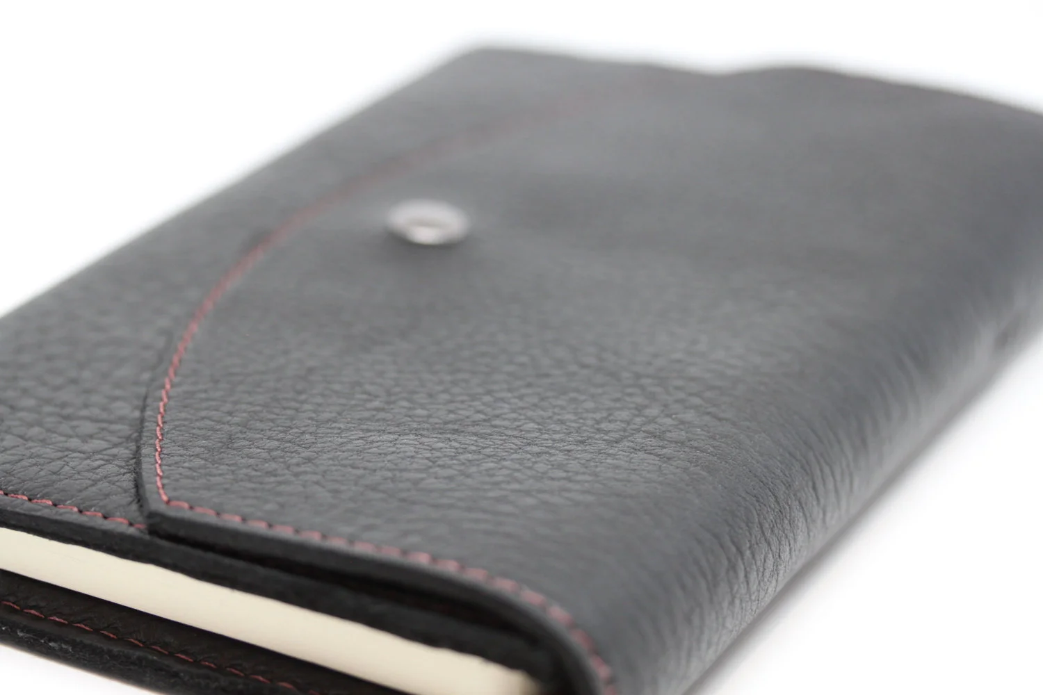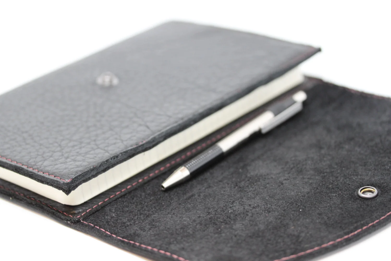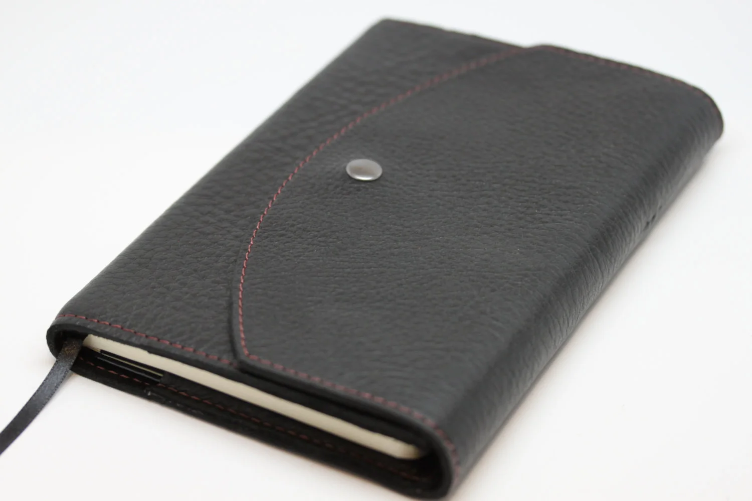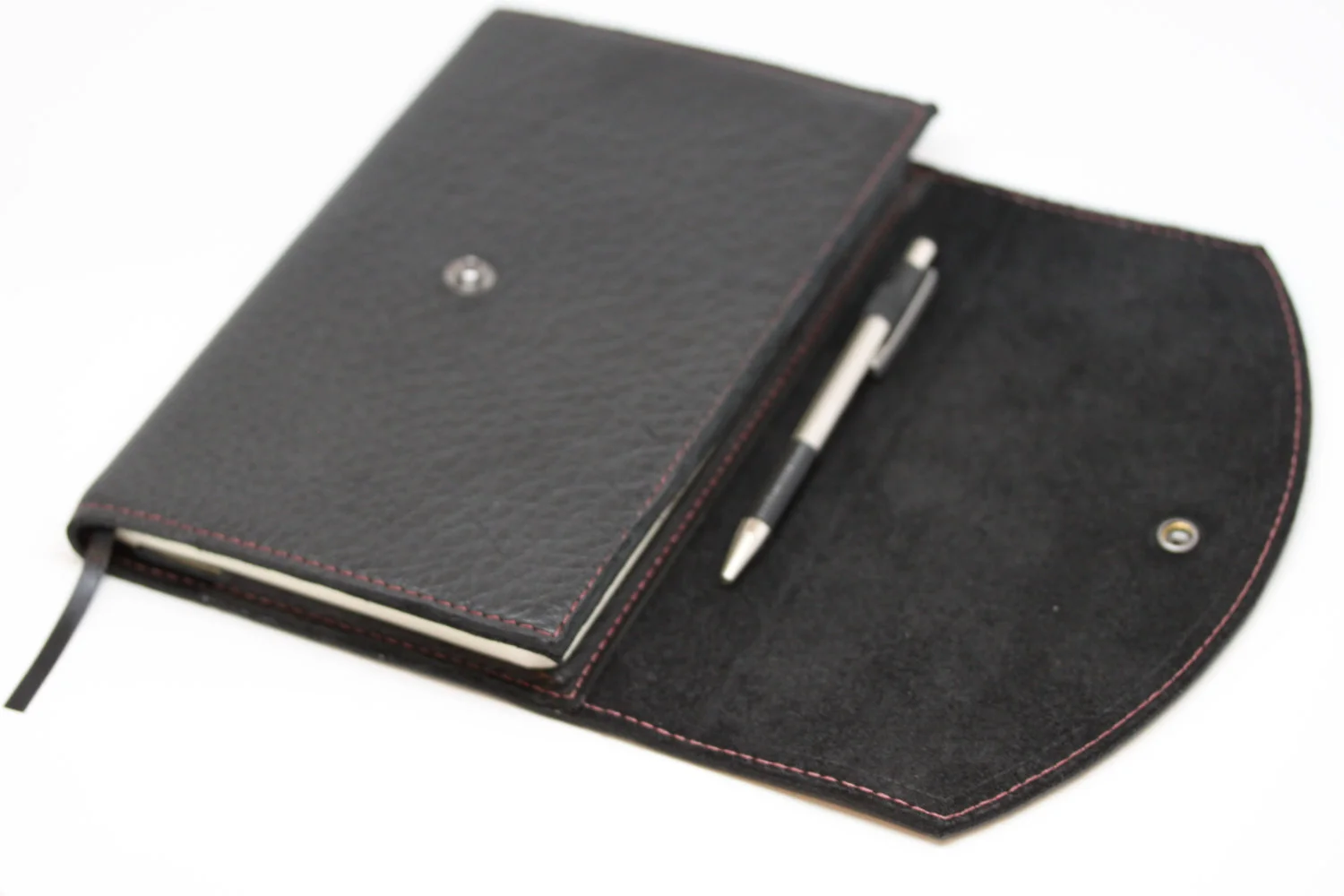 This Journal holder is made from a beautiful black leather. The leather is thick and soft and of superb quality! The leather is wonderful to touch and smells like leather should!
