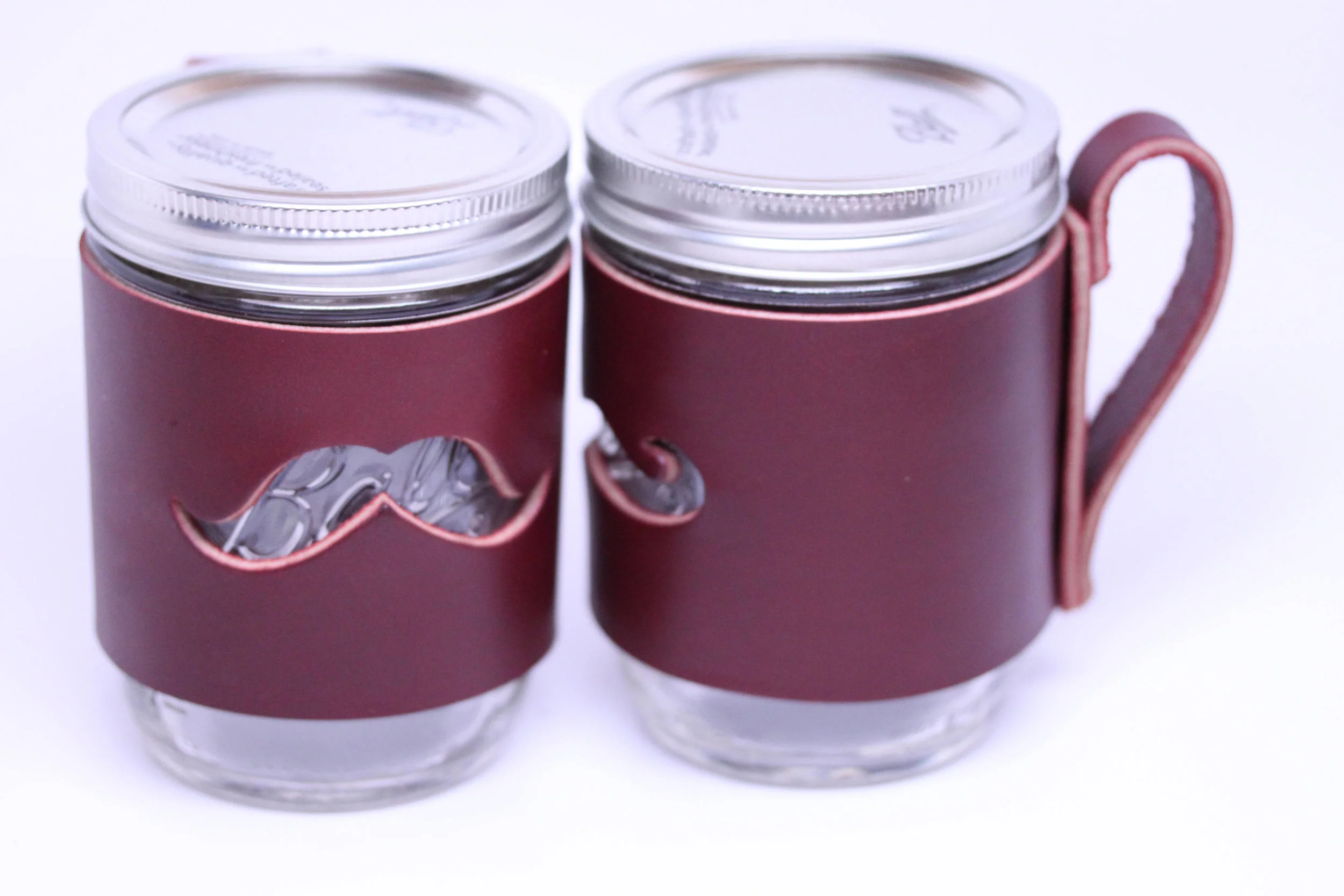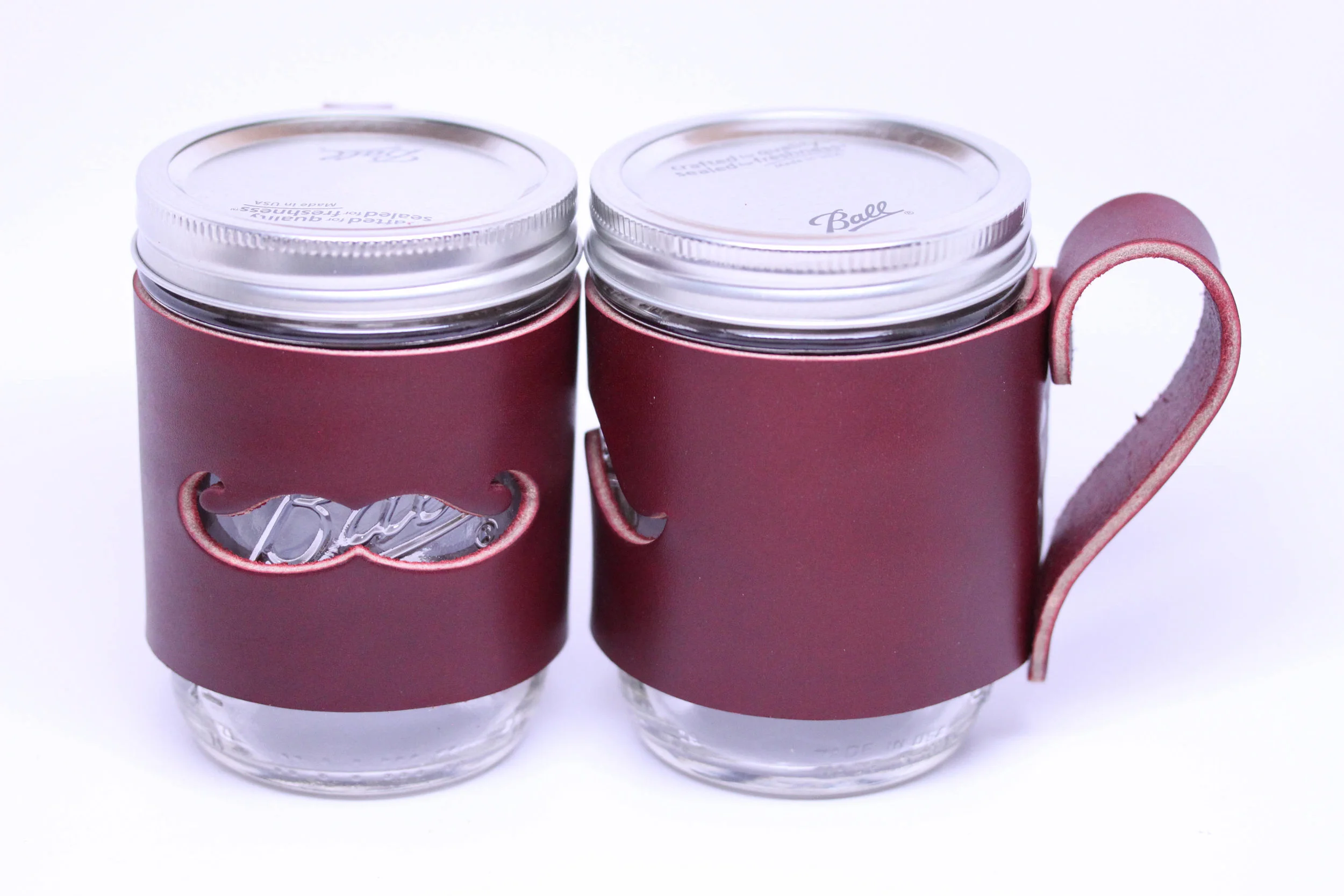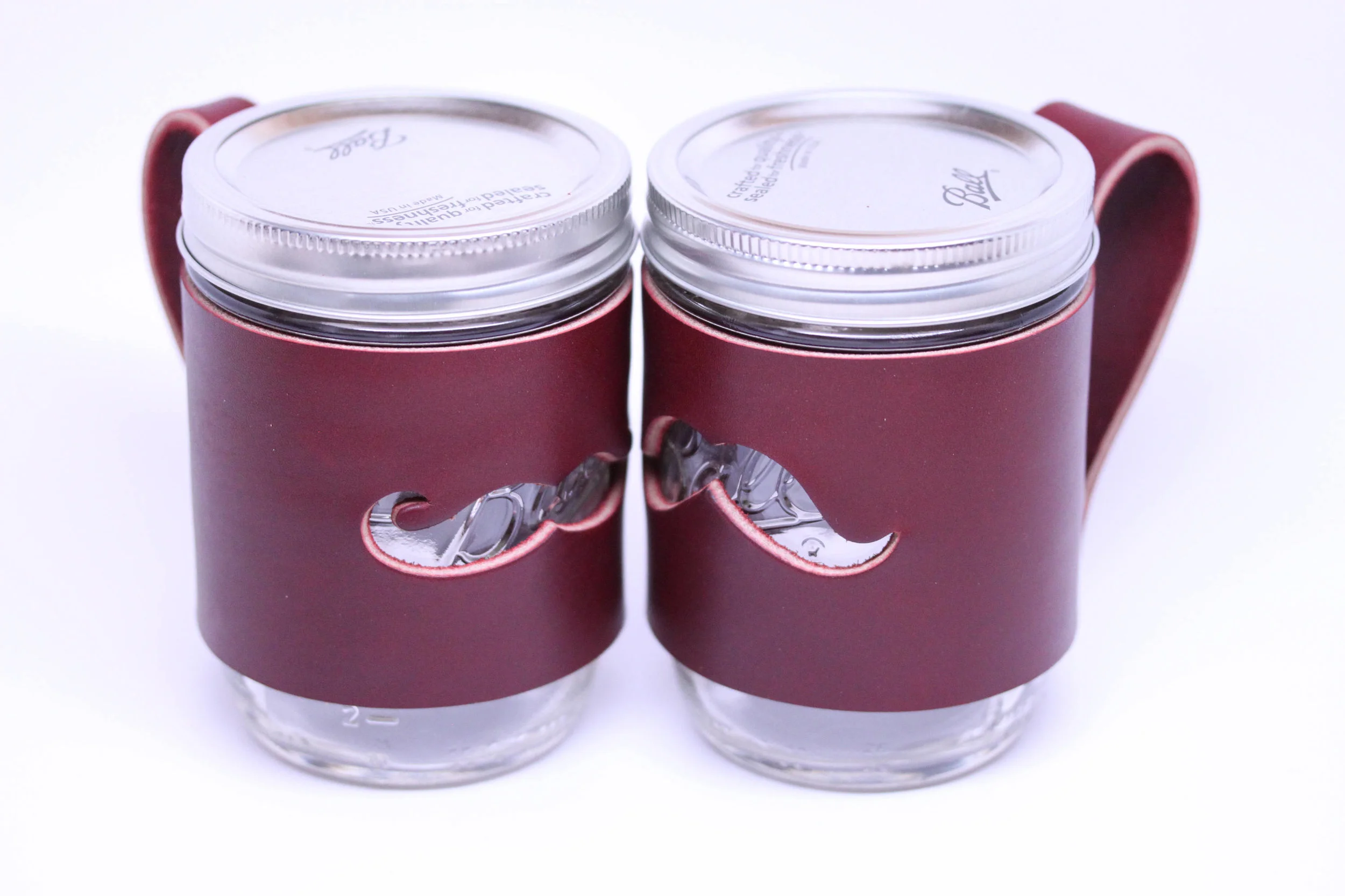 Handcrafted in USA: Mason Jar Cuff with handle. Thick Leather with Mustache cut-out. Ball Jar sleeve wrap pint