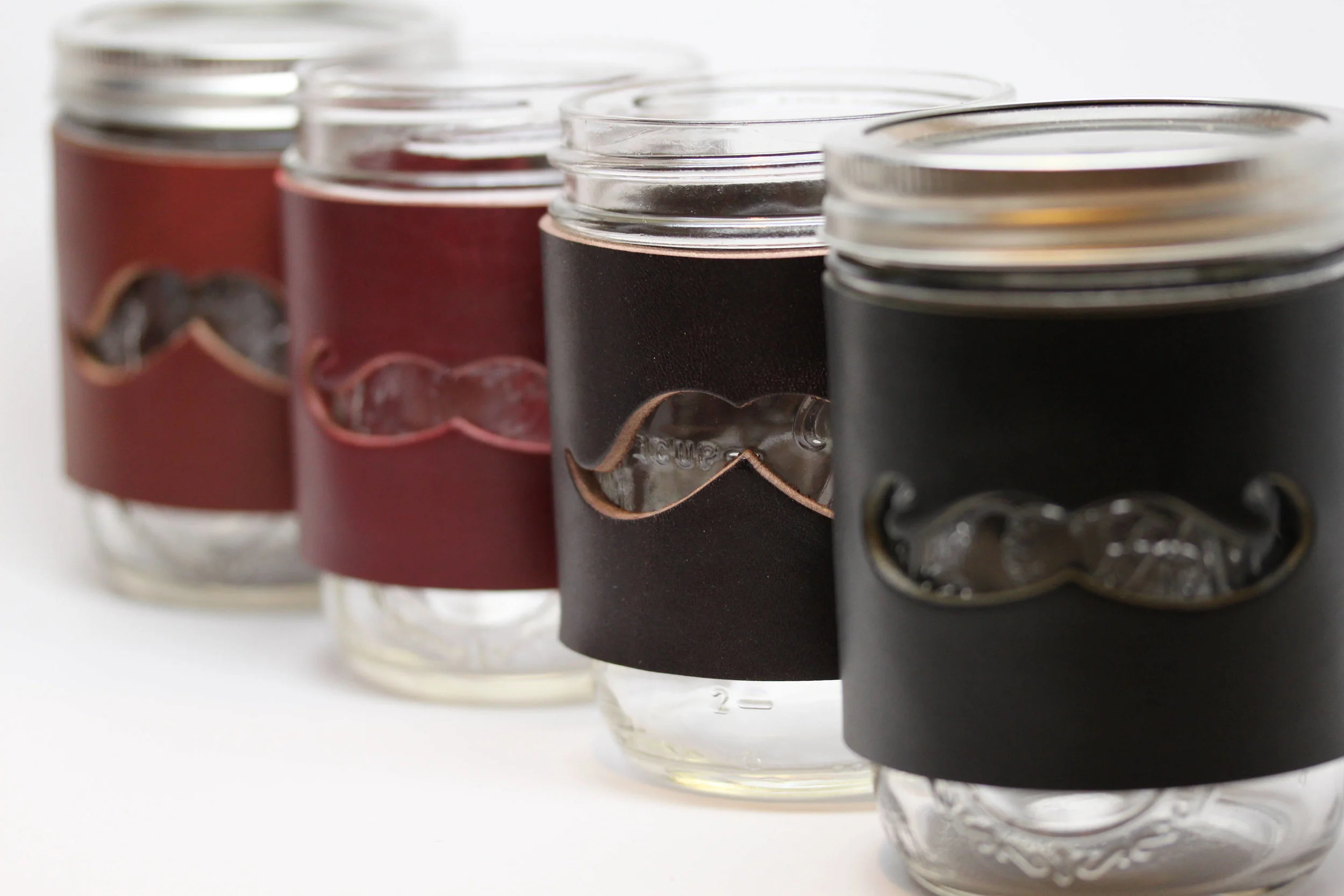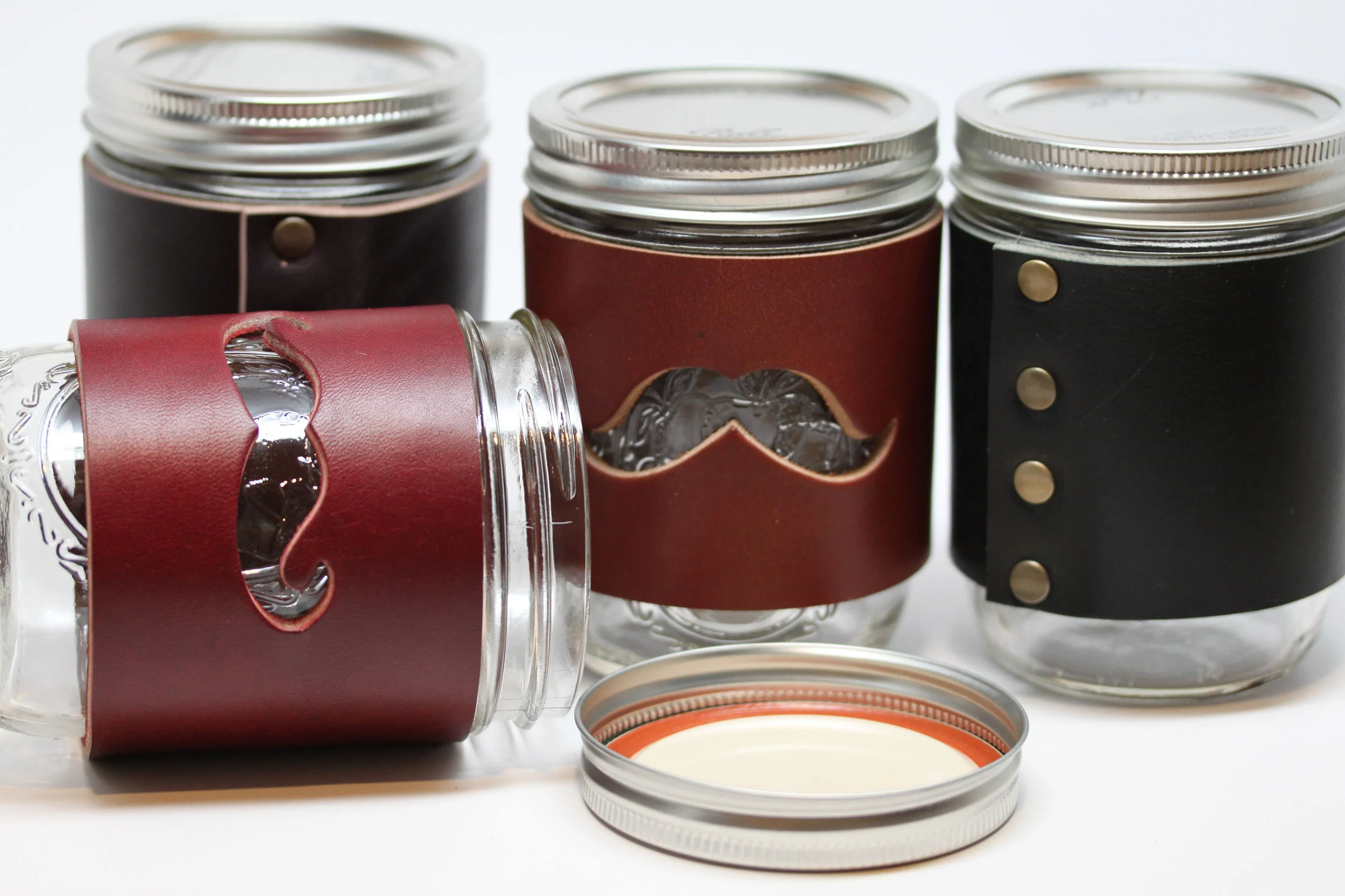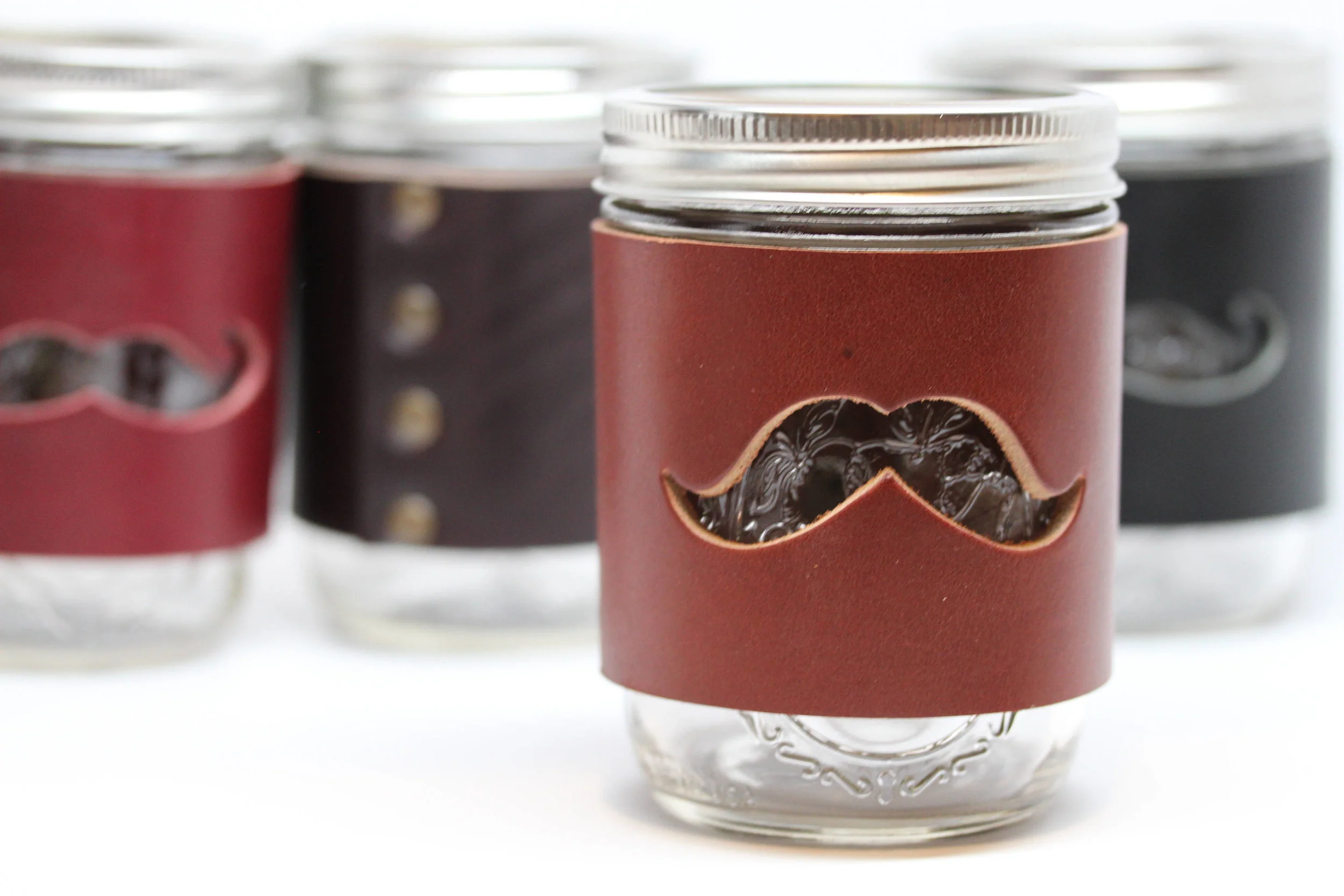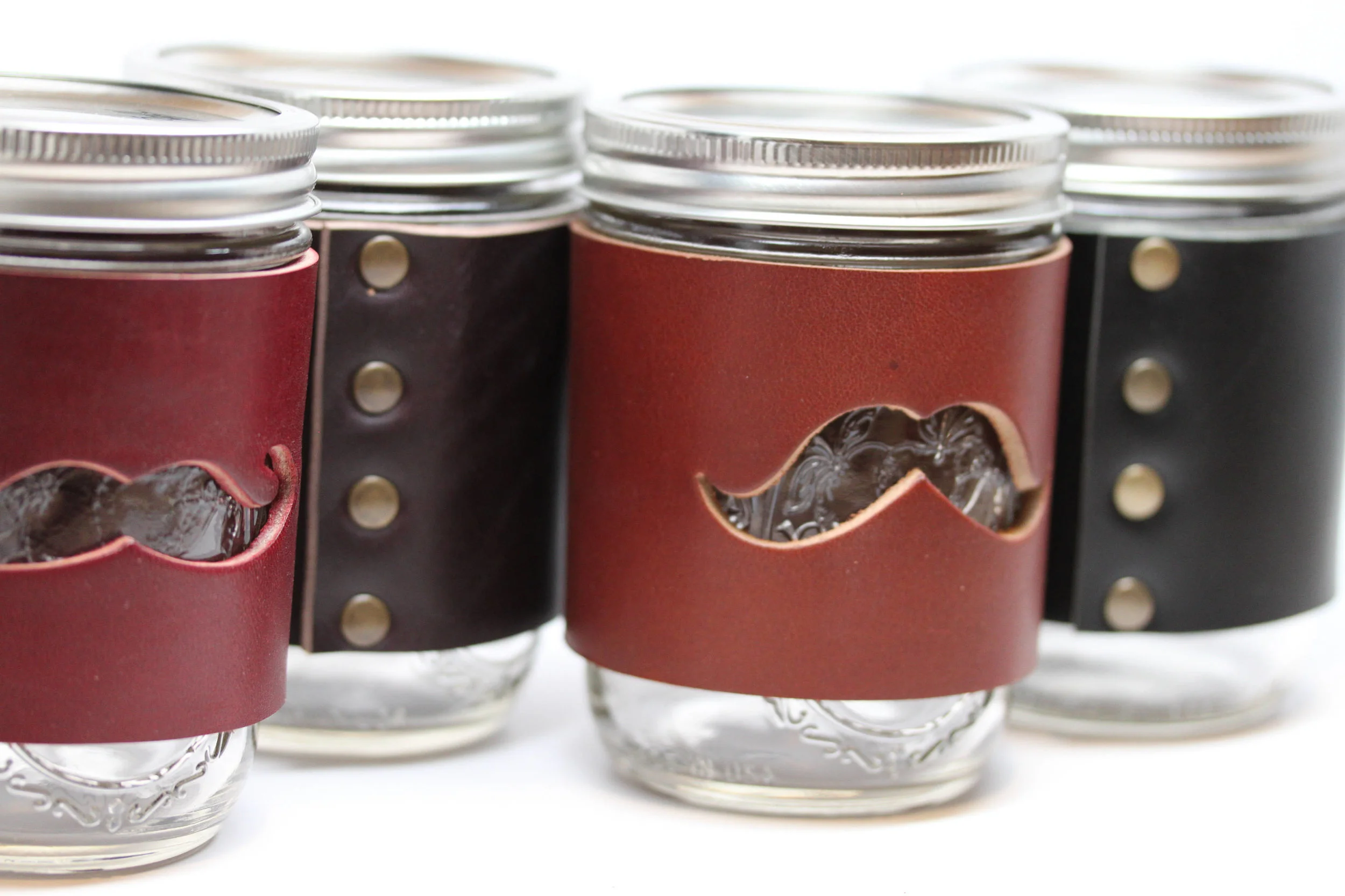 Set of 4 Mason Jar Cuffs. Thick Leather with Mustache cut-out. Ball Jar sleeve wrap pint